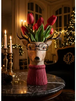 Ваза кашпо олень новогодний для цветов в очках на Новый год