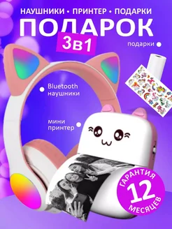 Новогодний розовый набор наушники с ушками и мини-принтер