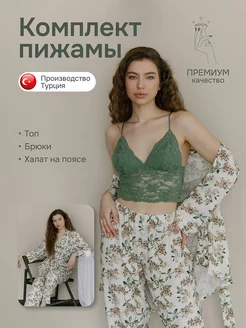 Комплект пижамы бра с брюками и халатом Турция