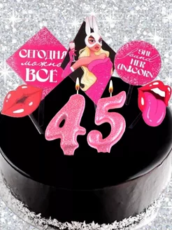 Свечи и топперы в торт розовые с блесками 45 лет