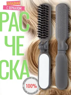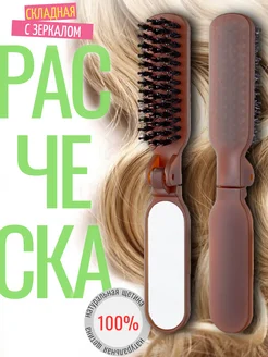 Расческа с натуральной щетиной складная для волос с зеркалом