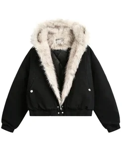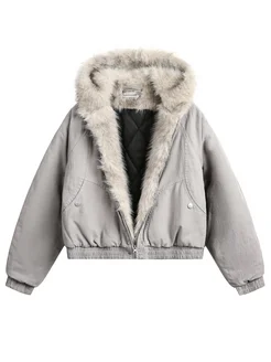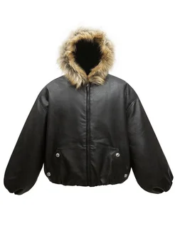 Куртка бомбер кроп укороченный оверсайз с мехом на капюшоне