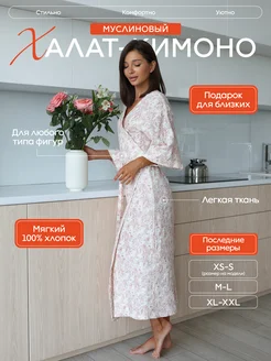Халат женский домашний муслиновый хлопок кимоно длинный