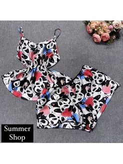 Пижама шелковая с пандами топ с шортами