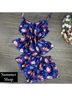 Пижама шелковая новогодняя топ с шортами