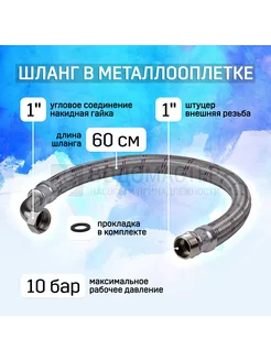 Шланг в металлической оплетке 1"х600 мм, с уголком
