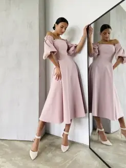 Платье миди со спущенными плечами вечернее