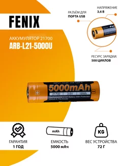 Аккумулятор 21700 Fenix ARB-L21-5000U с разъемом для USB