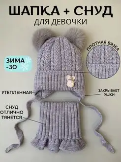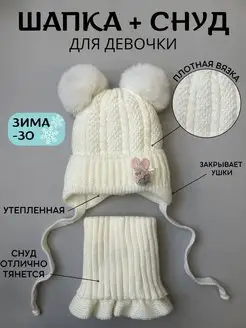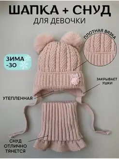 Шапка с ушками зимняя вязаная со снудом и помпоном