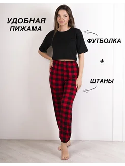 Пижама домашняя со штанами в клетку теплая комплект для сна