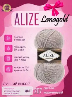 Пряжа Ализе Ланаголд 5шт светло-коричневый меланж 207