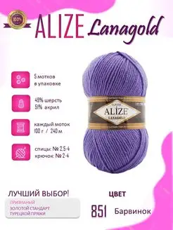 Пряжа Ализе Ланаголд 5 мотков 100г 240м цвет Барвинок 851