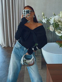 Блузка боди нарядная вечерняя с бантом и открытыми плечами