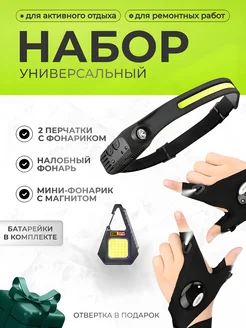Набор фонарь налобный аккумуляторный, перчатки и брелок