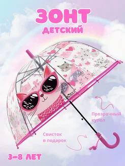Зонт детский для девочки прозрачный трость со свистком Котик