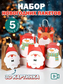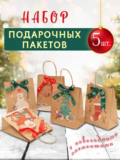 Подарочный пакет новогодний крафт, бумажный,набор из 5 штук
