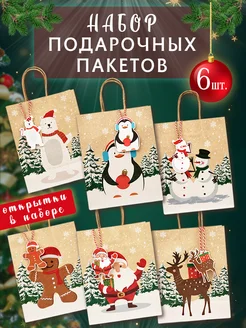 Подарочный пакет новогодний крафт, бумажный,набор 6 штук
