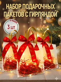 Подарочный пакет новогодний с гирляндой, набор из 3 штук