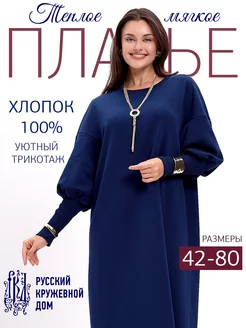 Платье хлопок теплое т синее трикотаж осеннее большой размер