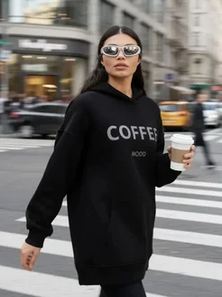 Удлиненное худи с начесом оверсайз с надписью coffee mood