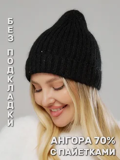 Шапка с пайетками вязаная тонкая с отворотом из ангоры