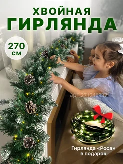 Хвойная гирлянда елочная 2,7 м с шишками, снегом и огнями