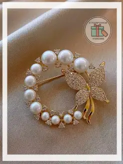 Брошь круглая с жемчугом и бабочкой