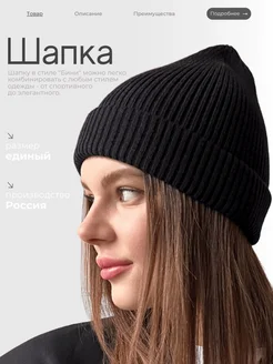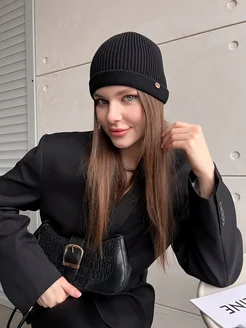 Шапка бини (beanie) вязаная с отворотом демисезонная
