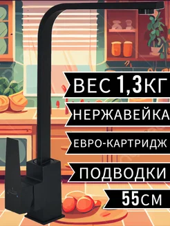 Смеситель для кухни черный матовый с подводками 55см