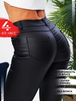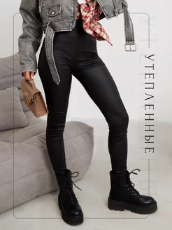 Джеггинсы с высокой талией утепленные на резинке из экокожи