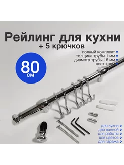 Рейлинг для кухни 80 см с 5 крючками Тип-2 хром
