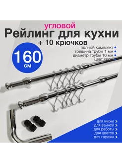 Рейлинг для кухни угловой 160 см с 10 крючками Тип-2 хром