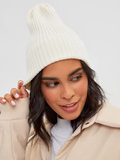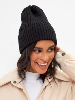 Шапка Бини в рубчик c подворотом шерсть 100%
