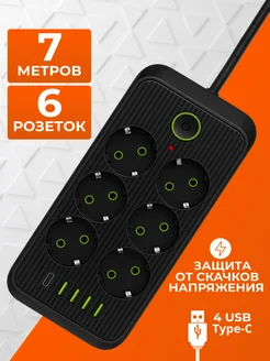 Сетевой фильтр 7 метров 6 розеток с USB и Type-C удлинитель