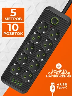 Сетевой фильтр 5 метров 10 розеток с USB и Type-C удлинитель