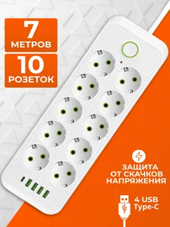 Сетевой фильтр 7 метров 10 розеток с USB и Type-C удлинитель