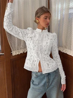 Белая рубашка женская нарядная, кружевная, с длинным рукавом