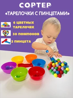 Сортер по цветам с тарелочками,пинцетами и помпонами,счет