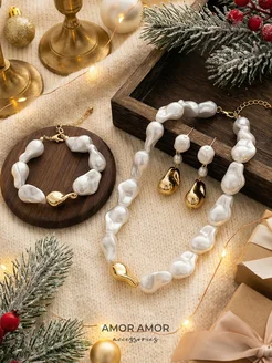 Жемчужный комплект крупной бижутерии колье серьги браслет