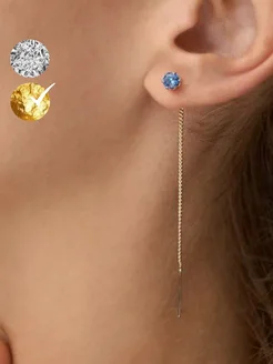 Серьги протяжки висячие длинные продевки с синим камнем