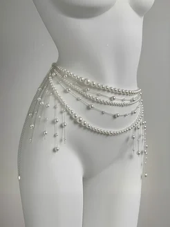 Пояс цепочка на талию тонкий с жемчугом и стразами