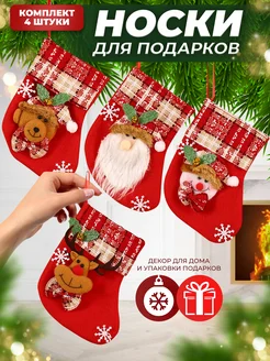 Новогодние носки для подарков и камина с декором набор 4 шт