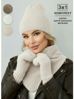 Комплект шапка и косынка с варежками зима вязаные 3в1