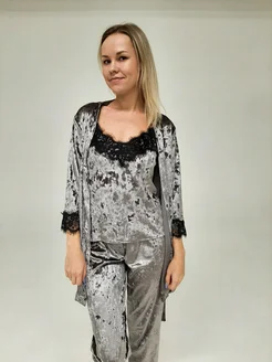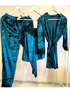 Пижама женская 3в1 из велюра халат майка брюки костюм велюр