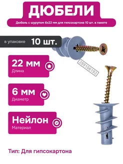 Нейлоновые дюбели для гипсокартона 6х22 мм с шурупом 10 шт