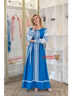 Платье в русском народном стиле славянское синее макси лён