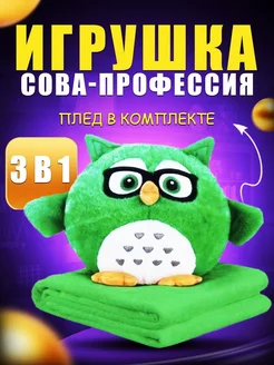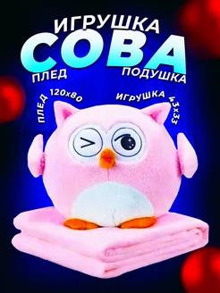 Игрушки мягкие антистресс сова с пледом 3в1 подушка детям