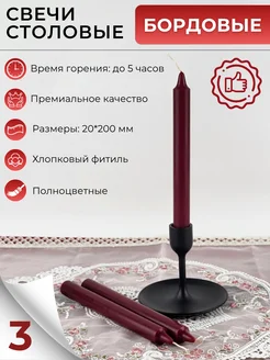 Свечи столовые полноцветные 20х200 мм бордовые 3 шт