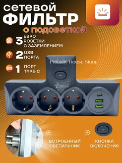 Тройник с подсветкой на 3 розетки 2 USB и Type-C