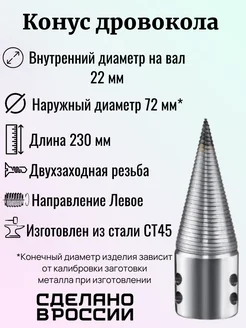 Конус винтового дровокола D 72 мм L 230 внутренний D 22 мм